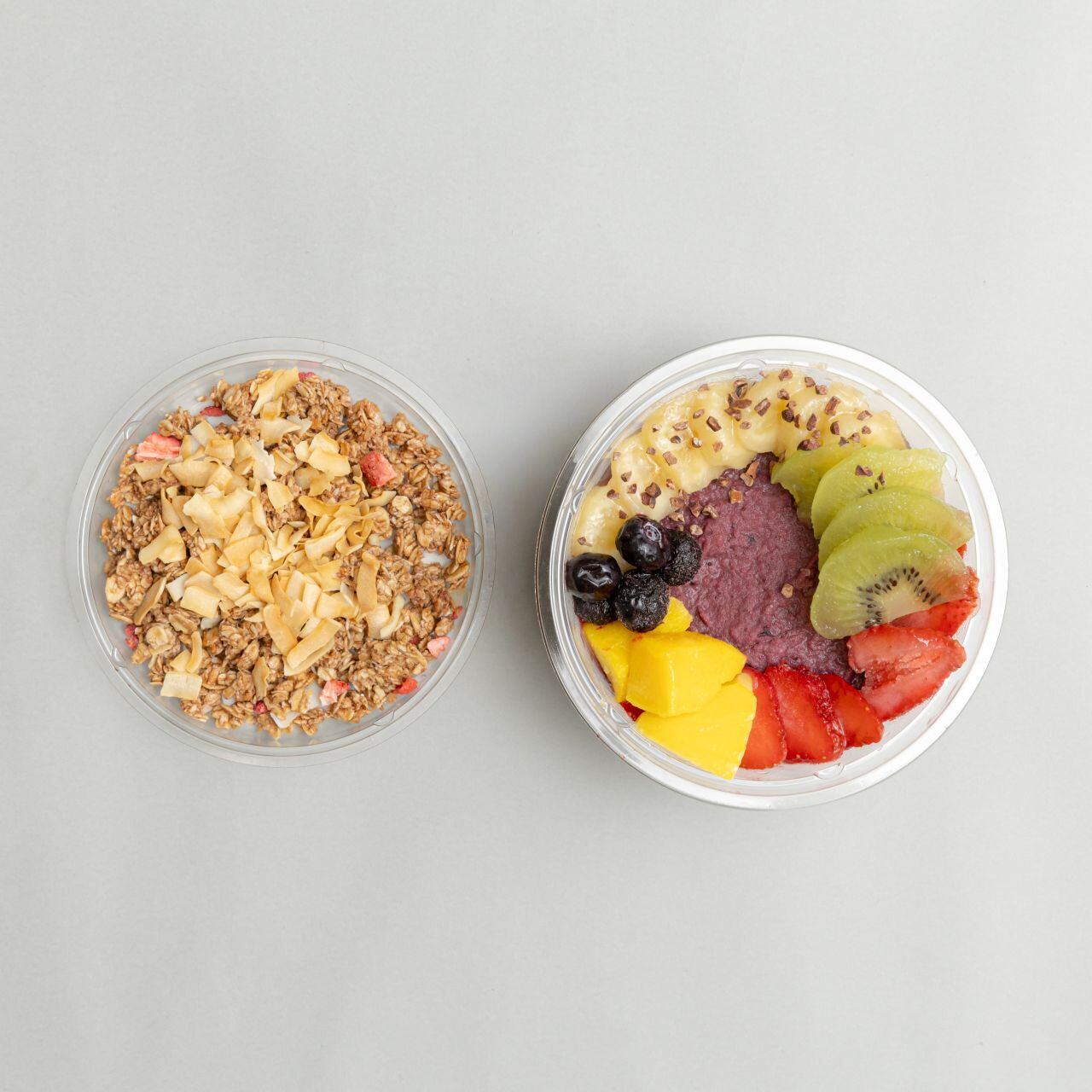 アサイー、イチゴ、ブルーベリー、バナナ、マンゴー、キウイ、ヨーグルト、アップルジュース、ブドウ、オーガニックグラノーラ、ココナッツチップス、カカオニブ、はちみつ